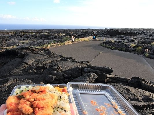 世界遺産の溶岩大地で食べたお弁当も満足!6時ころ食べるので、お腹が減る人はあらかじめ夜食をホテルの部屋に準備しておくといいと思います。(帰る時間が11時、オアフと違ってお店がやってない。ホテルのルームサービスしかないので。)