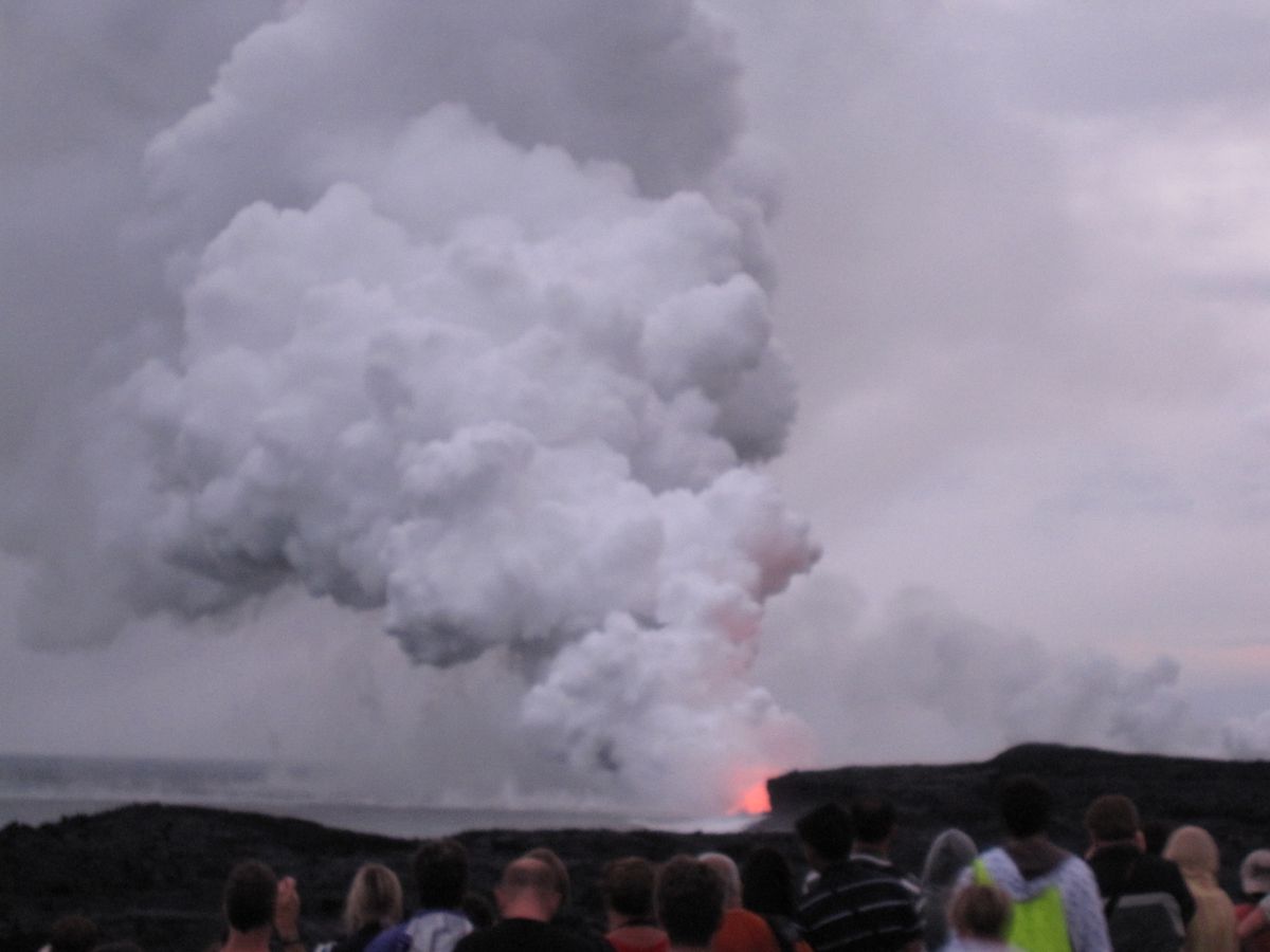 山肌の真っ赤な溶岩流と海に流れ込む溶岩流で立ち上る蒸気の両方が見えるポイントから双眼鏡も使って見学でき感動ものでした。