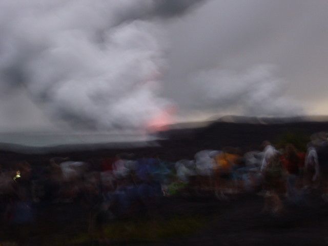 この頃には日が傾きかけて、キラウェアの山肌の溶岩の赤々とした部分も大分わかるようになりました。現在はこちらの場所は17:00~20:00までの入場のみですので昨年のような「日帰り観光」では難しかったと思います。やはり昼間の明るい時に見るのとはかなり印象が違い、これだけで参加して良かったと思いました。