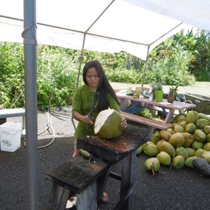 ホワイトパイナップルのご紹介は、今の時期から夏休み、9月くらいまで限定でお楽しみ頂く、「夏の超!レア企画」です。こちらは、アカカ滝の近くにあるファーマーズマーケットに立ち寄り、日本ではまず店頭にならぶことはなく、地元ハワイ島でもなかなかお目にかかれない「ホワイトパイナップル」のご試食とご紹介を致します!これは、自慢ではありませんが(笑)、アカカ滝を行程に入れている当ツアーだけの大特典!ちょっぴり自慢させてくださいね(笑)。ホワイトパイナップルは、きっと名前も聞いたことのない方がほとんどだと思います。生産時期が大変短いため、希少価値が高く、地元のマーケットでも大変珍しいものです。その特徴はなんといっても、普通のパイナップルの常識を覆す『甘さ』です!!これはもう、劇的と言っていいほどの甘味と香りで、パイナップルが苦手な理由によく挙げられる「酸味」がとても弱いのです。でも、そこはパイナップル。きちんとバランスのよいお味に仕上がっています。しかも果肉はまさに真っ白で、これがまた美しい!クレストでは、この貴重なパイナップルを、ツアーの行程上でご紹介することを数年前から行っており、お客様に大変喜ばれております。個人的にもパイナップル好きのコウジは、特にこの時期のご案内に力を入れており、時間調整に余念がありません!ただでさえもりだくさんのツアー行程に、さらにファーマーズマーケット立ち寄り時間を捻出するためには、本当に細部にわたる調整が必要なのです。TAKA様のお写真にもある「ヤシの実」も、アカカ滝近くの同じマーケットですよね。ラッキーであれば、とれたてフレッシュなココナッツジュースを飲ませてもらえるかも?!ただし、当日のお時間の都合で、立ち寄れない場合もございますので、ご容赦下さいませ。