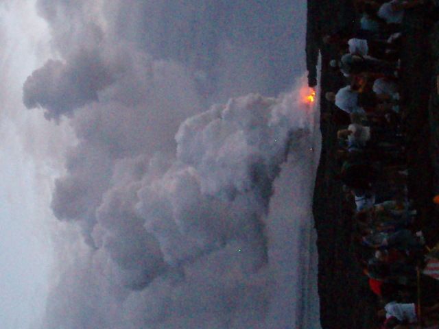 まで伝い、海に落ちて水蒸気を上げる。赤く輝く溶岩流は