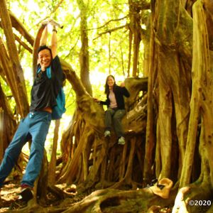 車窓からマウナケアとマウナロアの両方を眺めながら、しばしのドライブの後は、ガジュマルの木とレインボーフォールズ見学です。巨木にぶら下がったりつるに隠れたり、小人になった気分で写真撮影でき、楽しかったです!