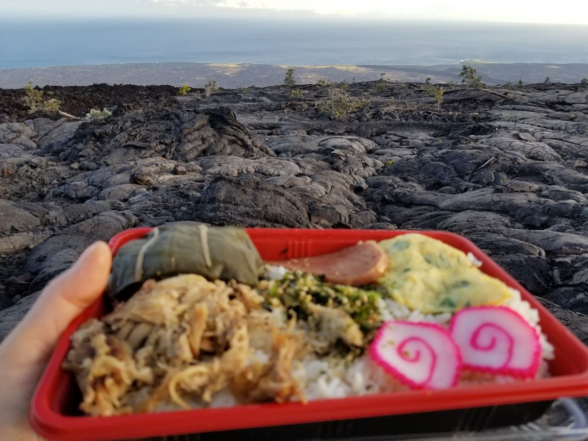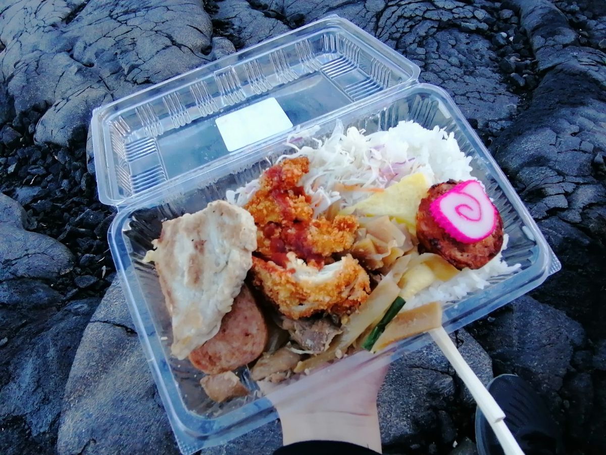 途中、サトウキビ栽培に携わっていた日系人所縁のホノカ・ア町内のTXドライブインで有名なマラサダを食べたり、ハワイ島一大きな町のヒロ市内のビッグアイランドキャンディに寄ったり、キラウェア溶岩台地でハワイ風弁当を食べるなどのハワイ文化?も味わいました。
