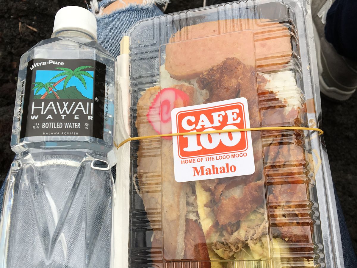 ・溶岩台地で早めの夕飯。Caffe100のお弁当とお水を貰いました。雨だったので溶岩台地や木に座るとズボンが湿りました。もちろん車内で食べてもOK