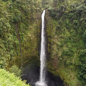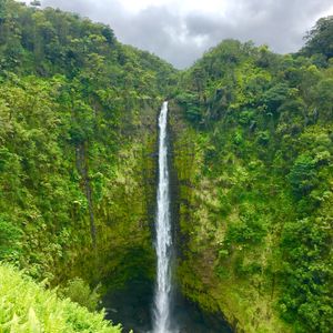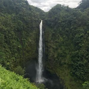 次に向かったのがアカカの滝。「ハワイ島は場所によって降水量が違うんです。ここが熱帯雨林なのも雨が多いから。ねっ、じめじめしてるでしょ?」すーさんの説明、すごい説得力。熱帯植物の温室からそのまま大自然の中に抜け出したような光景。一枚一枚の葉っぱがすごく大きい。ジンジャーやバナナの説明を一本一本丁寧にしてくださる。と、突然、目の前に落差100m以上もあるアカカの滝が。すごい!滝つぼに吸い込まれそうな大迫力!早速記念撮影。