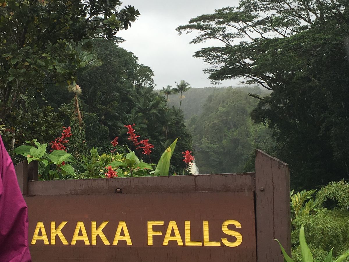 その後、メインイベントである昼間のキラウエア火山を見学の予定ですが、お天気が悪くなり傘をさしての見学でした。その後、溶岩石の上で夕食となるお弁当を頂きました。そこから、雨がどしゃぶりになり。。。楽しみにしていた洞窟の見学が雨が洞窟内に入って立ち入り禁止となり見学できず&夜の火口見学も雨でよく見えず、期待していた星空も土砂降りの雨で何も見えずに終わりました。ほぼ終日車に揺られ、クッキー工場&滝見学&火口を少し見るだけのツアーになってしまいました。