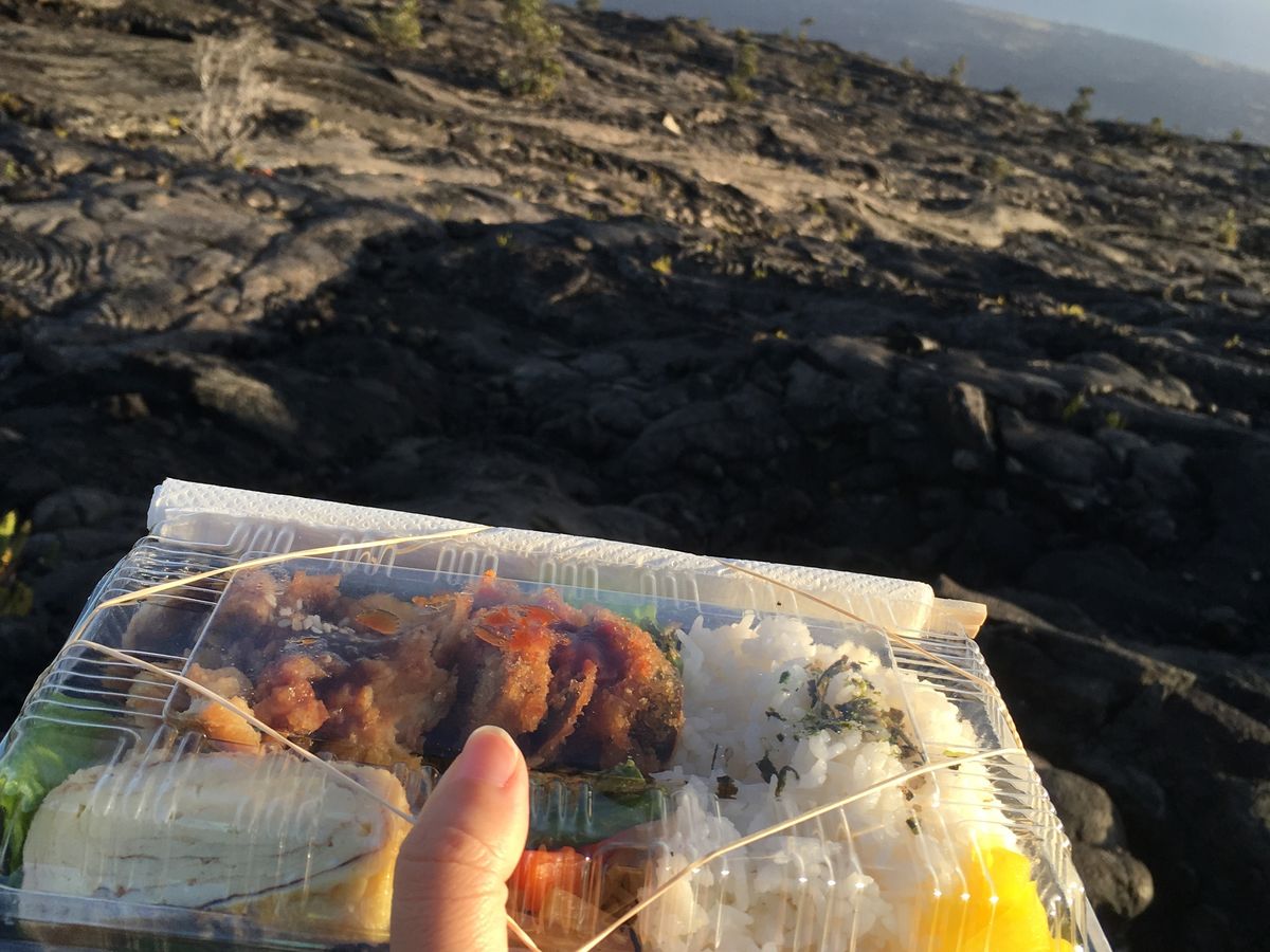 チェーンオブクレーターロードに移動して夕食のお弁当が配られました。このときには、雨がやみ、風は強かったですが、外でお弁当を食べることができました。お弁当はボリューム満点の幕内弁当でハワイにきて久々に食べる白米や和食がおいしかったです。