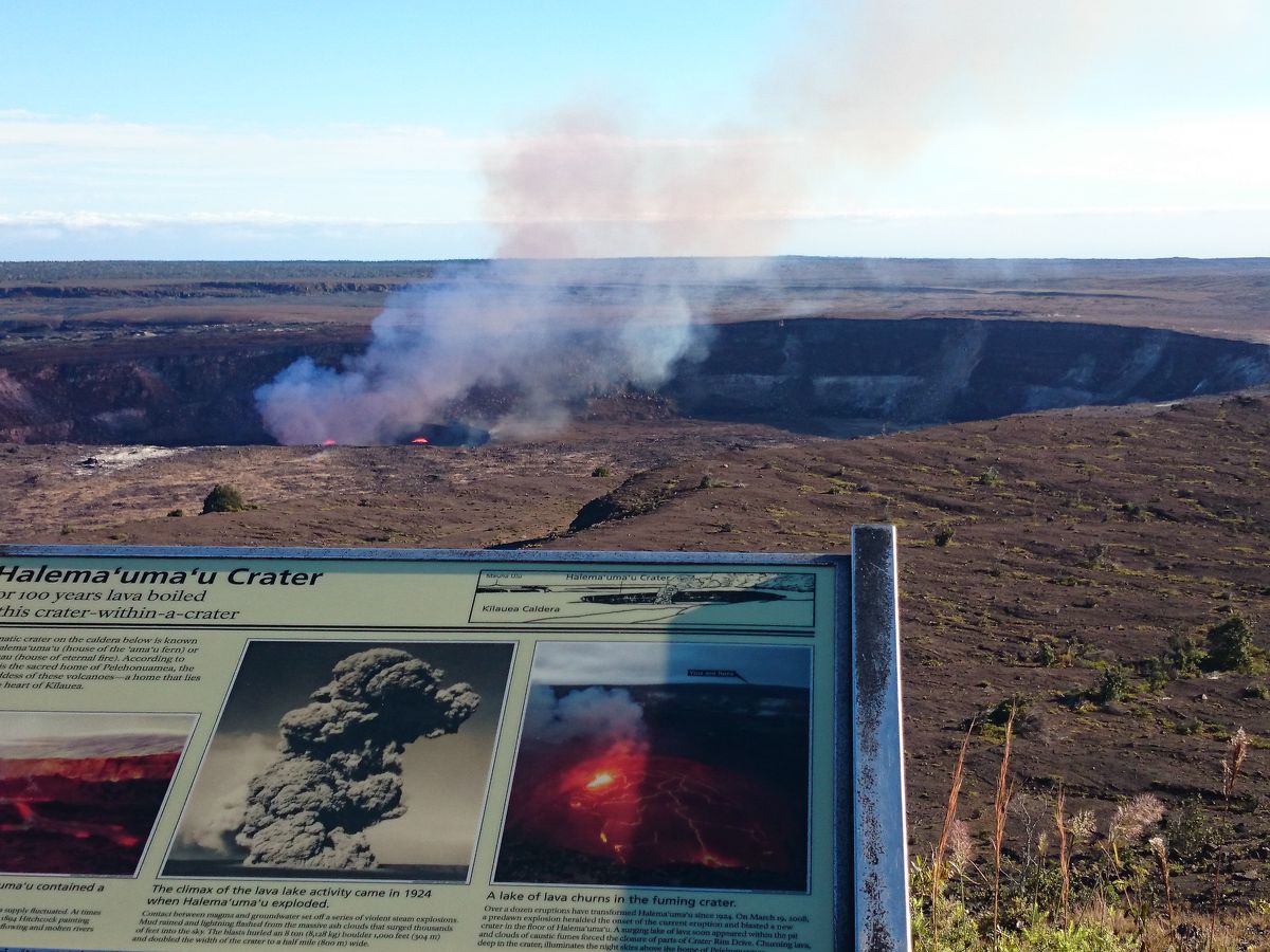 キラウエア火山国立公園に到着。ジャガーミュージアム前からおさかっハレマウマウ火口を見学。ミュージアム内には望遠鏡もあり、溶岩のうごきを間近に見ることができました。
