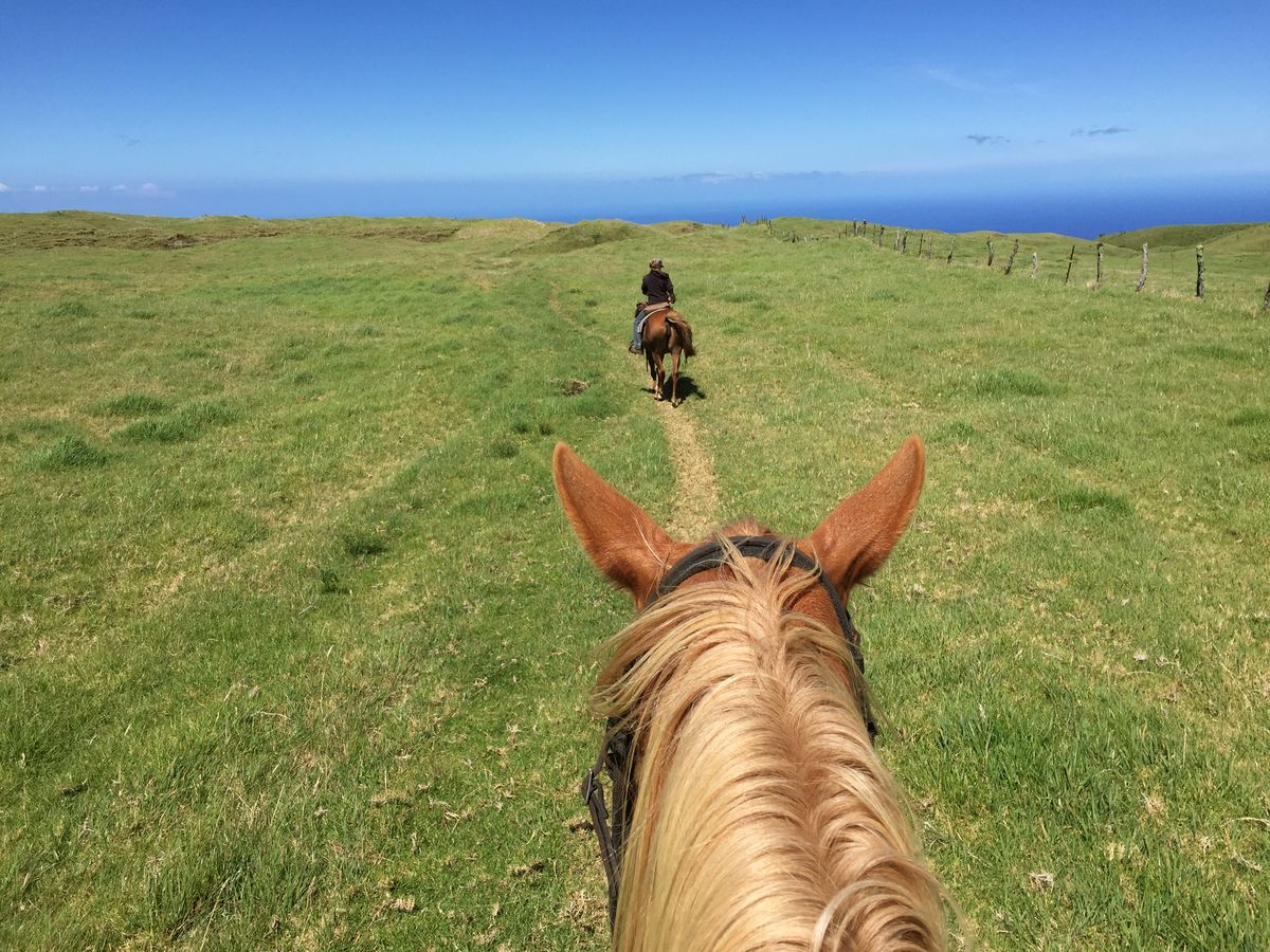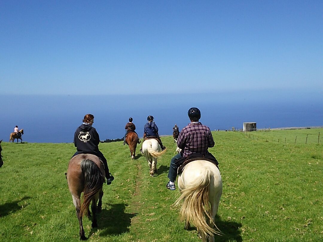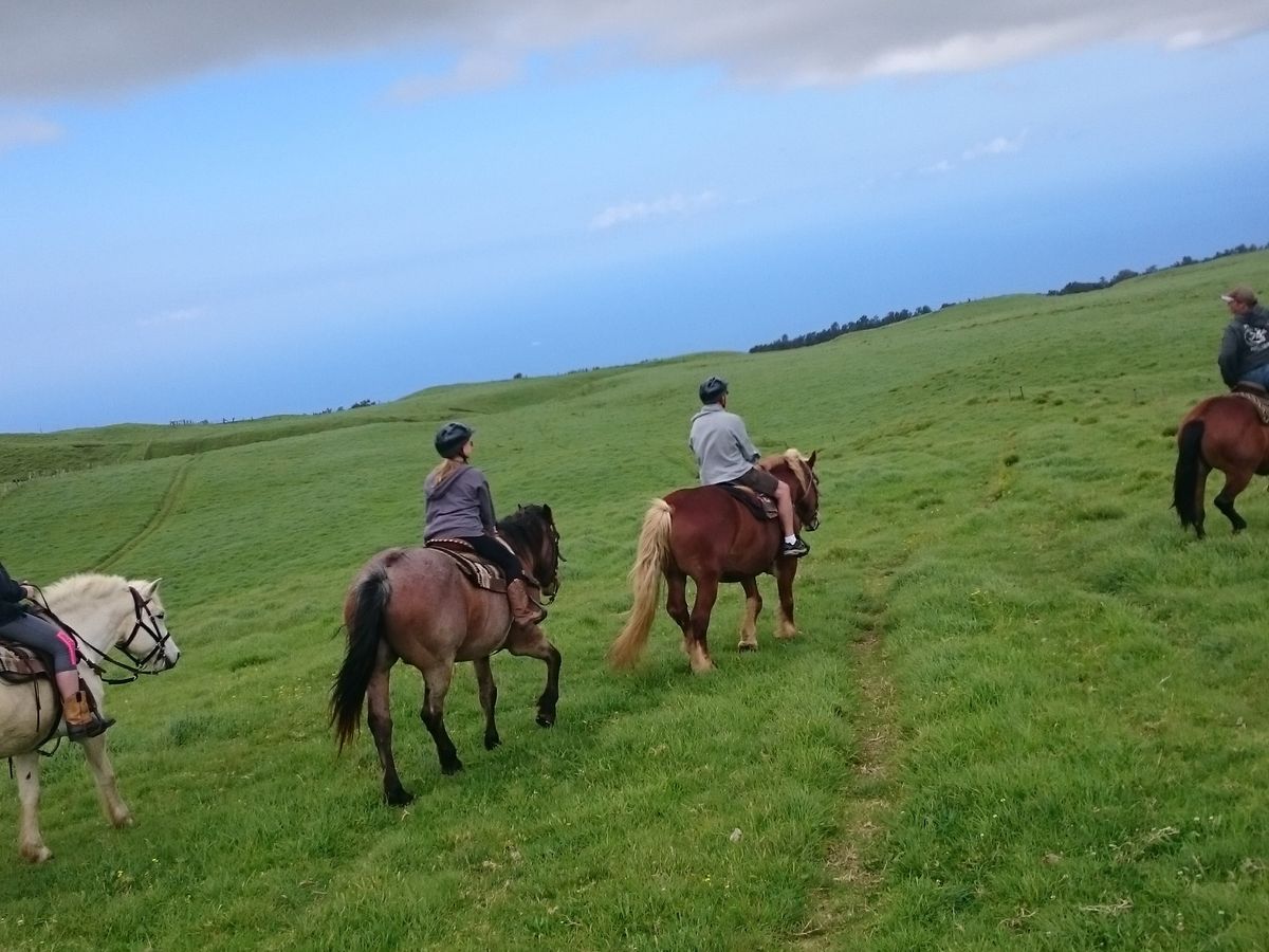集合場所は、観光名所に見かける大きな案内の看板がある訳ではなく普通の牧場の建物なので、少々わかりにくいところもありましたが、カーナビを頼りにどうにか到着。日本語で書かれたごく簡単な乗馬ガイドを一読した後に、ヘルメットをかぶりすぐ馬に跨って出発。この日は我々二人と女性ガイドの3人だけでした。馬はよく訓練されていて、こちらが特に何かやらなくてもあらかじめ決められたコースをゆっくりと歩いて進んでいく感じで特に危険は感じませんでした。海と山の絶景に囲まれた広大な丘陵地の牧場をのんびりと一時間以上の乗馬。途中で牛や羊の群れとも出くわします。日本では絶対にできそうもない体験でとてもお勧めです。
