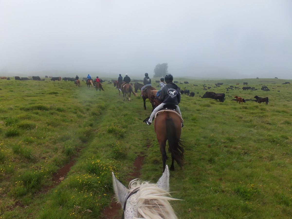 列を組んで出発。牧場じたいがかなり高い地域にあり、そこからさらに草原を登っていきます。途中から、一面の霧。上着を借りていて大正解でした。メガネも水滴で曇るほどでした。かなり寒い思いもしましたが、霧が晴れるとさわやかな空気に包まれます。出発から2時間半弱、休憩も取らず、馬に乗りっぱなしです。日本の乗馬体験とは、とにかくスケールが違いました。