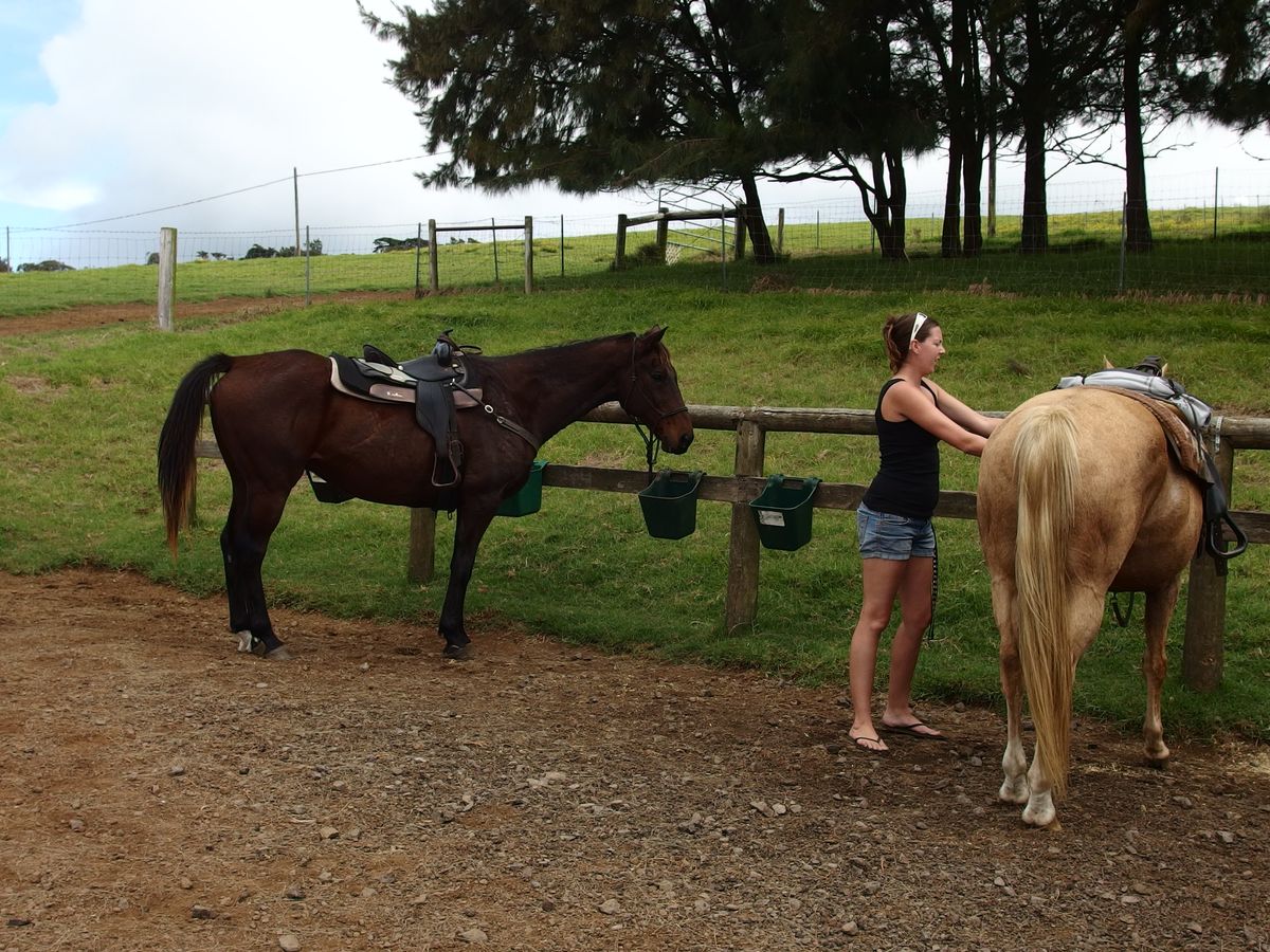 Tシャツしか着ていなかったので、上着とヘルメットを借りることにしました。簡単なレクチャー(英語でしたが、話せない私でもなんとなくわかります。動き出しや止め方、横に行かせる仕方などを教えてくれます。)を受けた後、体つきを見て、馬を決めてくれます。私の馬は、唯一の葦毛でどっしりとした「スモーキー」です。80キロの私を支えるにはちょうどいいかな。