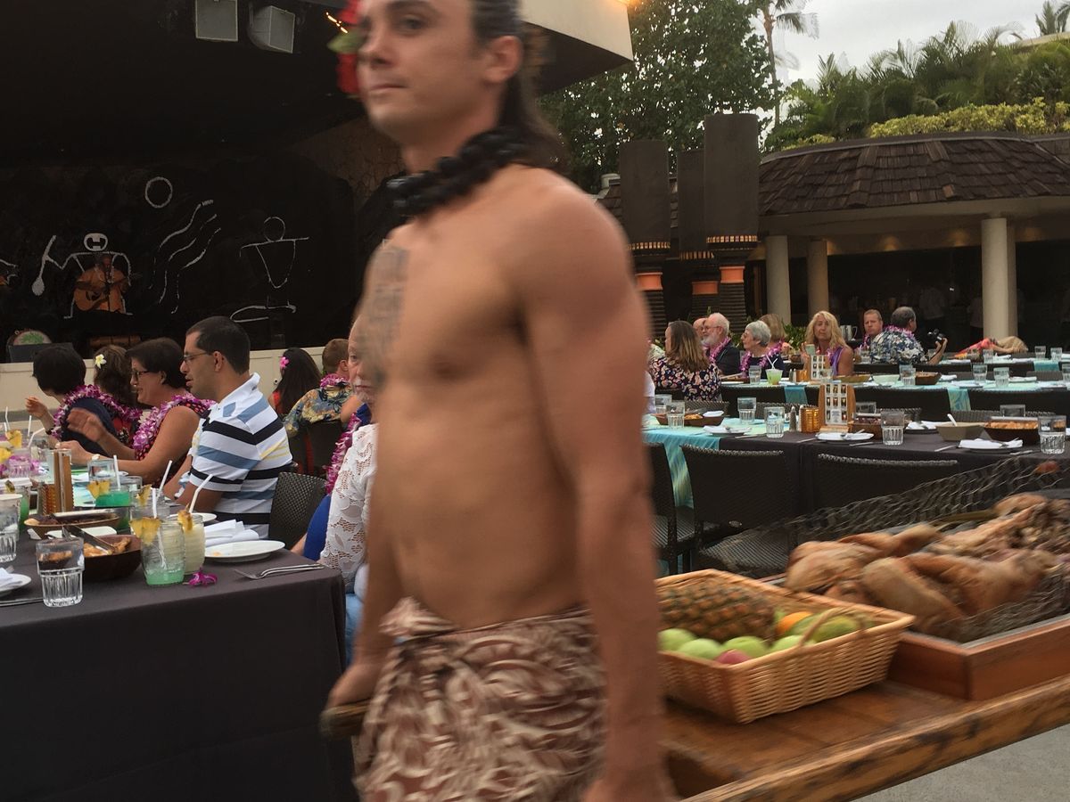 ホテルの駐車場に車を停めました。普通宿泊客でない駐車料は高いですがルアウの客は5ドルで停められました。会場は長テーブルで相席になりますが他のテーブルも皆知り合い同士じゃないのでお互い気になりません。食事もおいしく、パフォーマンスも楽しく、3歳未満の息子も楽しめました。小さい子は途中で飽きてしまうか心配でしたが、踊りや音楽が興味深かったようでおとなしくじっとステージを見て喜んでいました。