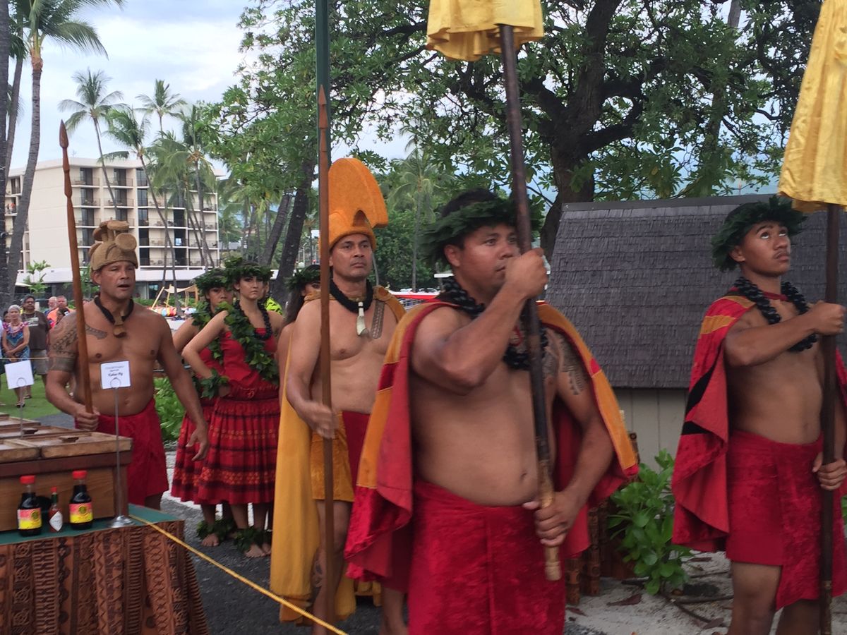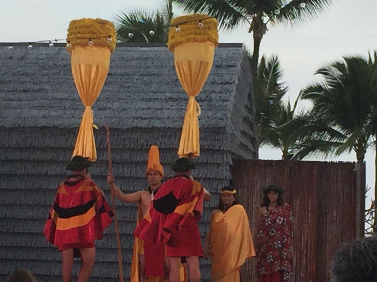 会場につくとず~っとゆったりとしたハワイアンミュージックが演奏されています。全員がテーブルにつくまで、席に座って待ちます。飲み物は入口の近くに自分でとりにいきます。大人はビールやマイタイが提供され、子どもは赤いクランベリージュースのみです。10歳の子供はそれがダメでした。それと同時に5種類くらいの昔の遊びや顔や足にスタンプのような飾りをつけたりと伝統的な昔の遊びの紹介があります。それに参加するかどうかは自由です。その後フラダンスのレッスンがあつたり、伝統的な料理、バナナの皮に肉を包んで蒸すなどの説明があったり、30分くらいの自由な時間があります。その間もハワイアンミュージックがずっとかかってます。入場して一時間くらい経つとようやく海からカメハメハ大王が陸に上陸してきます。