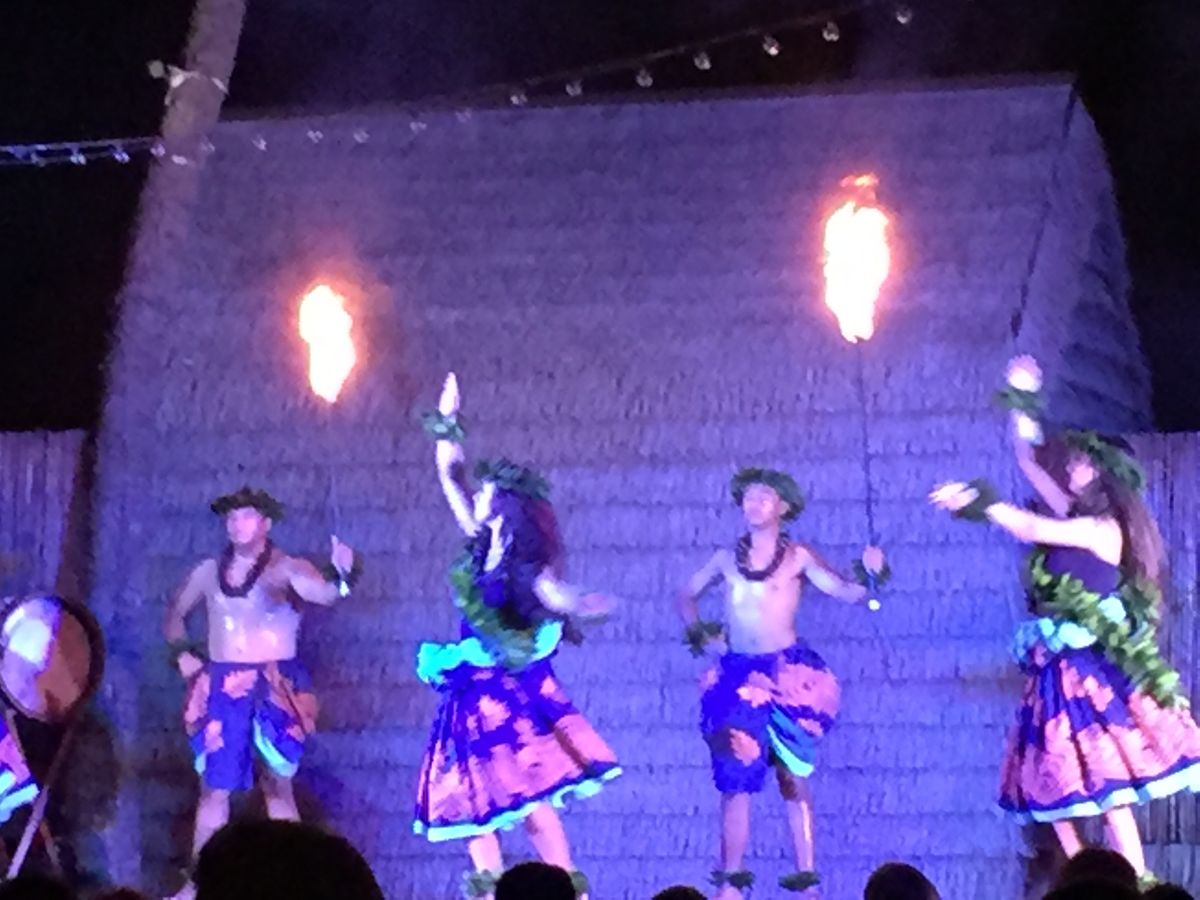 フラダンスとファイアーダンスのショーは迫力がありました。味のある司会者(女性)がショーの進行をされており、そのトークに欧米人はかなりノリノリでした。私は英語力をつけなければと痛感しました。