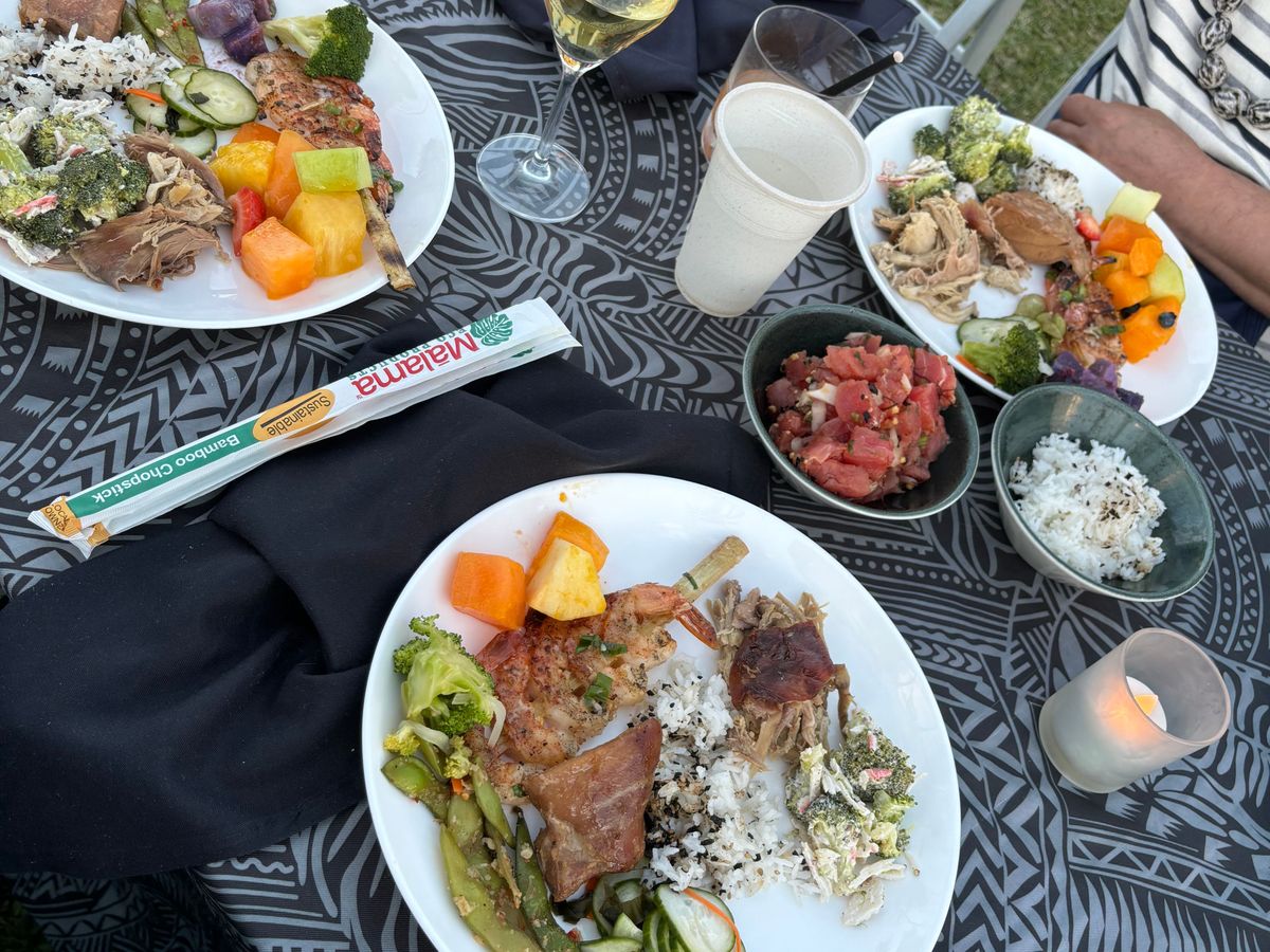 食べ物については、絶賛するレビューを読んでいたのですが、期待には届きませんでしたが、全てが悪いわけではありません。選択肢とバラエティは豊富でしたが、全体的には「まあまあ」という感じでした。ポケ、魚、エビ、鶏肉は良かったですが、牛肉と豚肉はひどかったです。実際の豚の丸焼きはなく、提供されたプルドポークは明らかに最近掘り起こされた焼き豚からのものではなく、味もひどかったです。これは最大の失望で、ルアウに行くと素晴らしいプルドポークを期待するものです。飲み物のバラエティも不足していて、ワイン(「赤」か「白」のみ)やビール(缶の安い種類が数種類、IPAはなし)の選択肢はあまりありませんでした。また、混合飲料も材料が限られていて(例えば、オールドファッションを作れなかった)、基本的なカクテルを作るための基本的な材料はありましたが、飲み物の最大の不満は、長い列ができていて、全体のグループのために2人のバーテンダーしかいなかったことです。他のルアウでは、基本的な飲み物が常に用意されていて、いつでも基本的な飲み物を手に入れることができました。