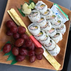 クルージングで日が沈むのを眺めながら寿司ロールとブドウと飲み物が振舞われました。おいしかったです。