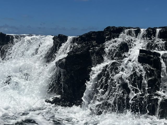 あまり何本も行くとストレスになるそうで、その後はゆっくり走るボートの上から見ました。そういう、生き物を尊重する素敵な姿勢がハワイには多いなと感じます。写真を撮りながらずっと並走できる感じでしたが、お別れを告げて離れました。その後はケアラクア湾でトロピカルな魚を見ながらゆったりシュノーケリングをして帰港しました。帰港途中も、ボートだから近づける崖で溶岩の通り道を見せてくれたりと案内があり、内容たっぷりのツアーでした。次回ハワイ島に来たらまた絶対参加します。船長の的確な判断と誘導、まみさんの気遣いと勇敢なガイドに感謝します。