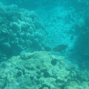 シュノーケルスポットは水深は深い(10m弱くらいかな?)ですがかなり海の透明度が高く、底が見えます。グレートバリアリーフのような大量の熱帯魚に囲まれることはありませんが、カラフルな魚には割と出会えるので楽しめるかと。