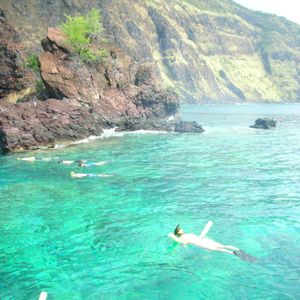 出航すると溶岩大地と並走するように碧い海を(結構なスピードで!)進んで行きました。参加者は10人ちょっとくらいで、日本人は私達入れて2組だけでした。スポットに着くと添乗員が泳ぐ範囲などの説明をして、各々好きな時に海に入って行きました。