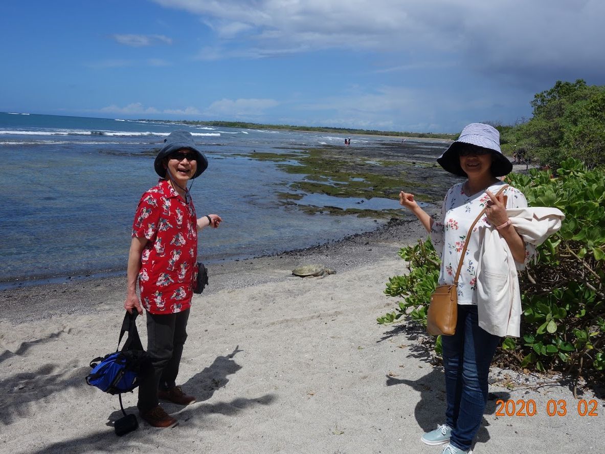 コロナ・ウイルスの影響で海外渡航を心配視される中、青い海・青い空に白い雲、光り輝く太陽の陽射しを浴びてコナ国際空港に降り立ちました。この体験談によく登場されるFガイドさんが、ネームプレートを持って出迎えてくれました。私達も初めてのハワイ島で、チェックインまでの時間を有効に過ごそうと思い参加しました。コーヒー農園では、清々しい天気のもと、植物の説明や、とりわけコーヒーについて詳しい説明を受け、オレンジを採って食べたり、コーヒーの試飲をさせて頂き、その美味しさに感動。海が一望できる見晴らしでまったりゆったりして、飛行機の疲れやコロナのことも忘れていました。ポップコーンとナッツのサービスも有難うございました。ホノコハウビーチ散策では、亀にも出会うことが出来ました。そして、コナタウン散策では、孫に可愛らしいアロハとムームーをお土産に購入し、小腹が空いた時に「タコス」を美味しく頂きました。お土産を安く購入するならと、Walmartにも寄って頂き、滞在中にホテルからトロリーに乗って出掛け、情報に感謝します。「還暦祝い」の私達夫婦一組だけのツアーになり、ハワイ島初日から親切・丁寧な対応でした。