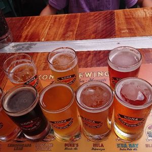 農園の次はコナ・ブリューイング・カンパニーで昼食。メニューはピザとサラダとドリンク。ピザは二人で1枚ですがボリュームは十分。ドリンクはもちろんビール(小学生の子供はソフトドリンクでした)。ビールは普通のグラスかサンプラーを選べます。普通のグラスだと1杯。サンプラーのグラスは小さいですがその代わりに4杯あります。もちろんそれぞれ違うビールを頼めます。