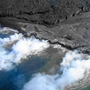海岸では海に流れ込む溶岩と白い煙がはっきり見えました。