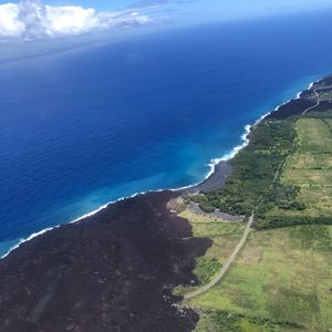 火口もさることながら、溶岩の流れ出た道筋、直ぐ側の途切れた道路や民家、また、それに続く海岸線の美しさ。
