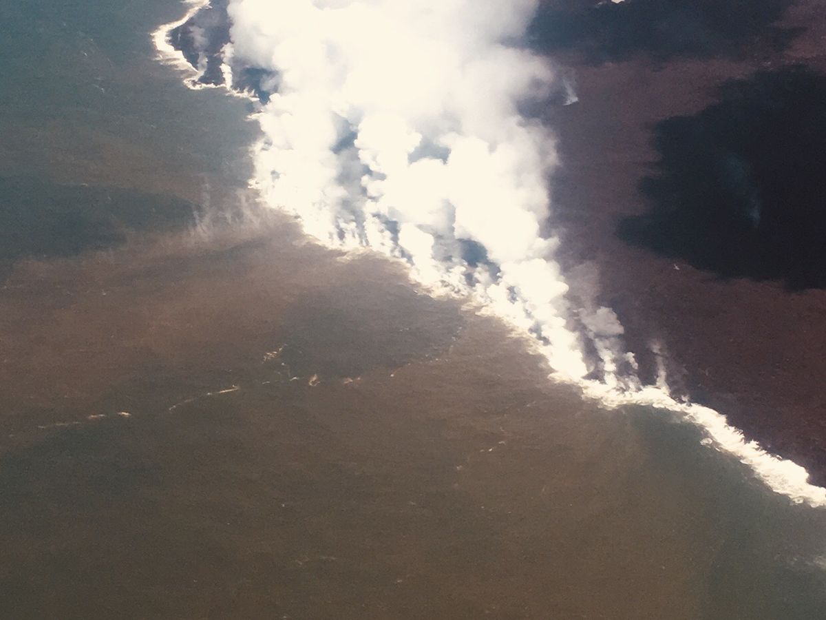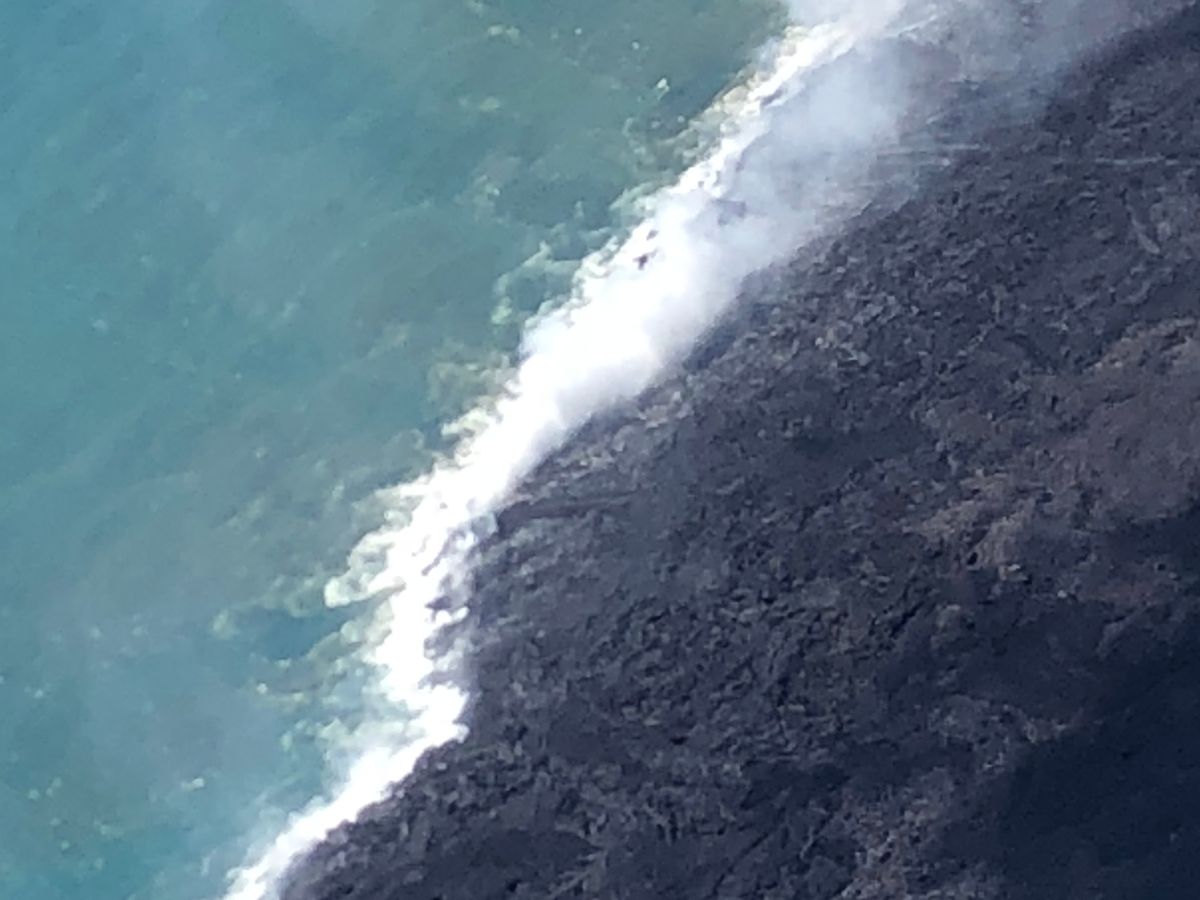 生憎の雨でしたので、画像はクリアに撮影出来ず。雨のせいで溶岩流からは蒸気が立ち上り、見えにくい状態だったのですが、操縦士さんが、何度も蒸気の隙間を通り抜けて、座席の左右公平に見えるようにコントロールしてくれました。海岸部分も、溶岩が落ち込んでいるラインが真っ白に煙っており、地球が生きていることが実感出来ました。