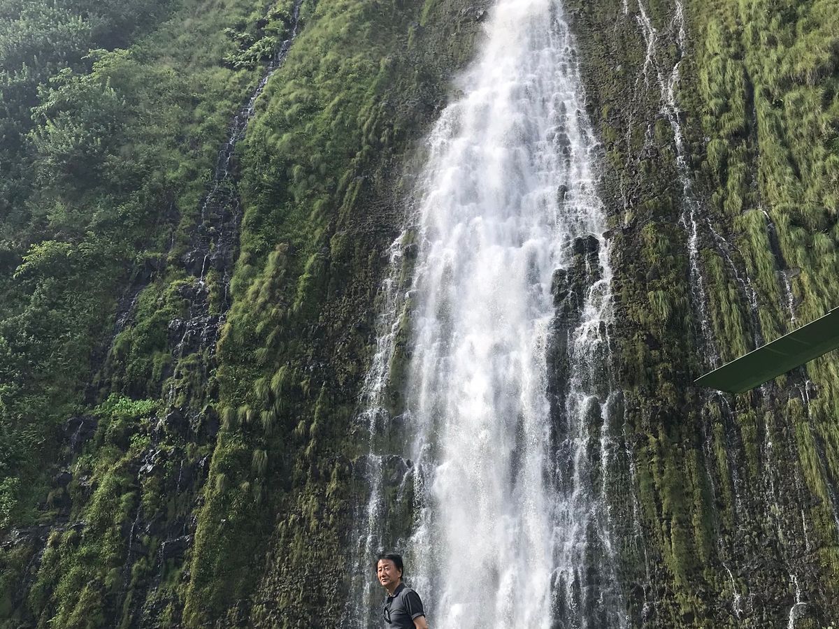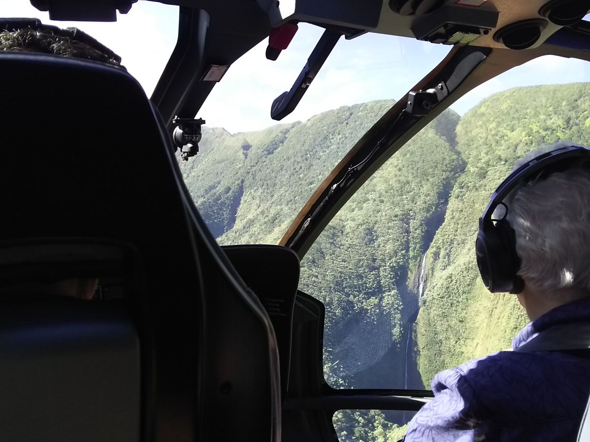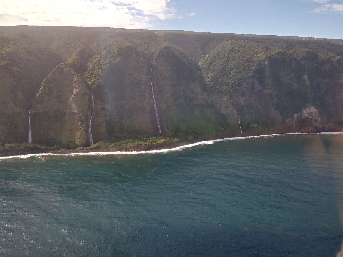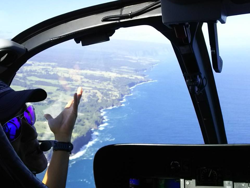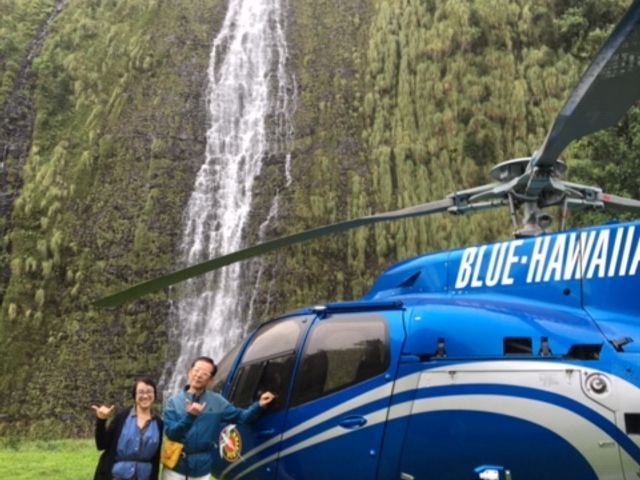 人生初のヘリコプターで、朝一番のツアーから戻ってくるヘリコプターを見ているだけで、大興奮! 緊急用の救命胴衣を着けてもらって、乗り込み、ヘッドセットとインカムを渡されて、うわっ、カッコいい!! 最初は緊張していて、離陸も少し怖かったけど、全然揺れないし、景色は良く見えるしで、楽しむことができました。キラウエア火山の活動が活発だったため、ハレマウマウ火口には近寄れませんでしたが、ハマクアコーストの入り江に入って、滝に接近したのはヘリコプターならではの体験でした。興奮していて、乗る前に乗り物酔いを飲み忘れてしまったので、下ばかり見ていて、途中少し酔ってしまいました。次回は酔い止め薬を飲んで、是非ハレマウマウ火口を見たいと思います。