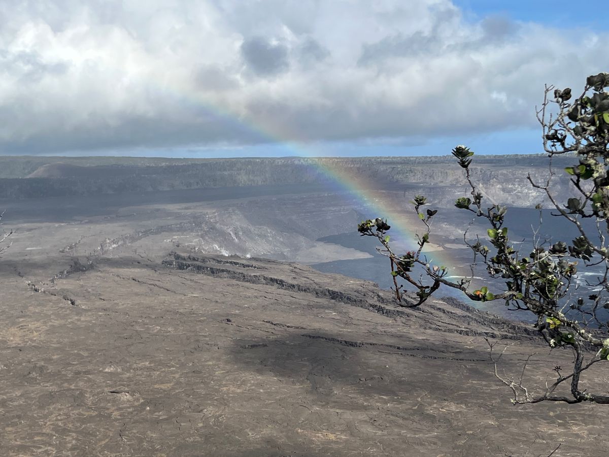 次に訪れたのはキラウェア火山。残念ながらマグマは見ることができませんでしたが、火口の上には美しい虹がかかり、神秘的な光景に出会うことができました。