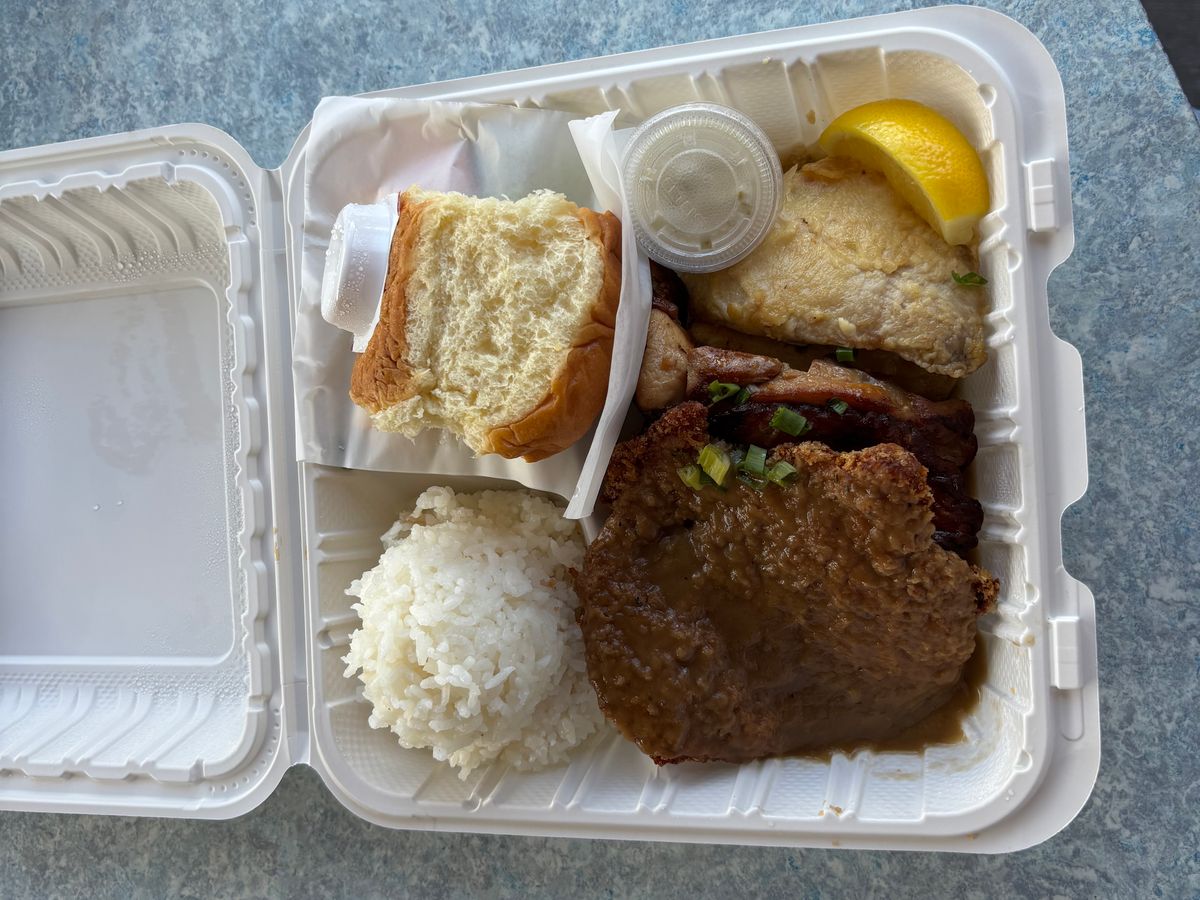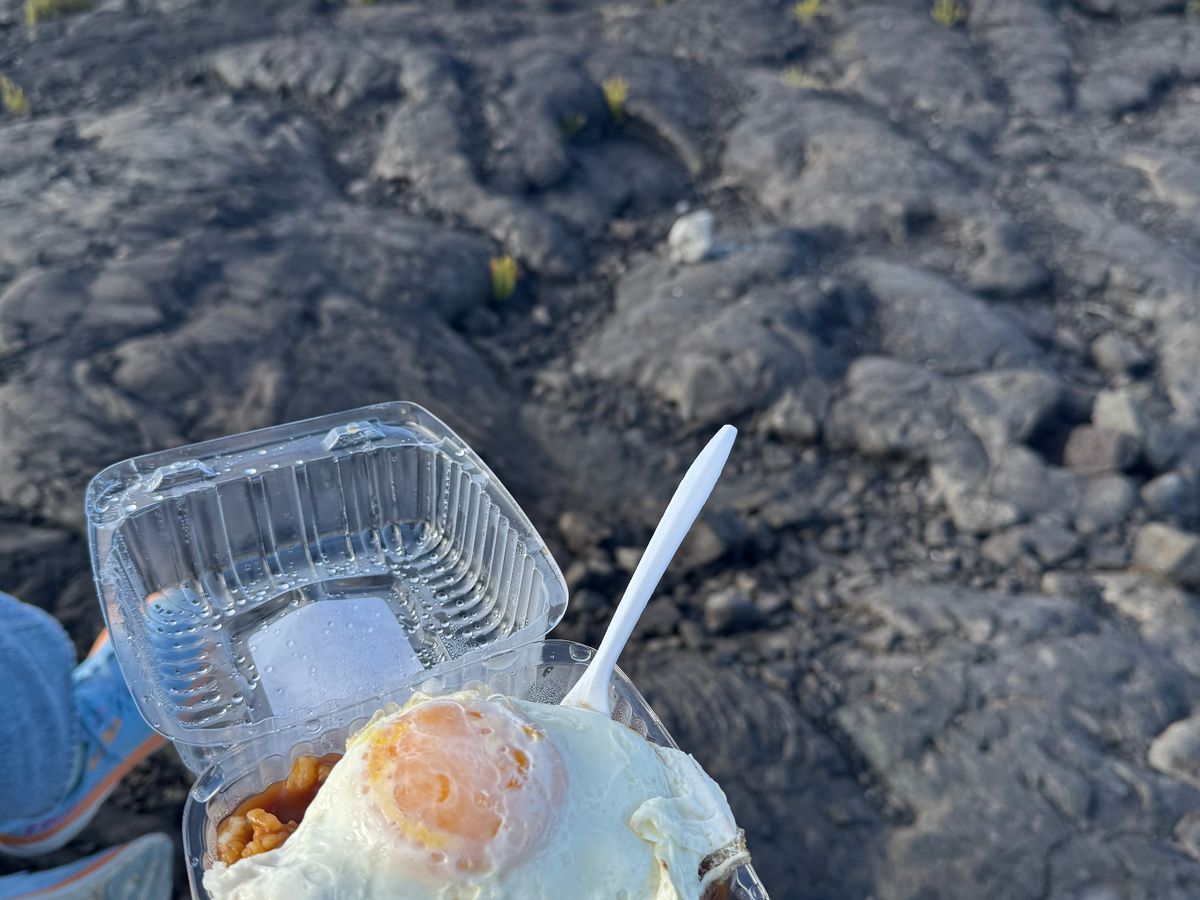 そのあと、公園内の道路を走りながら雨の切れ間を探して、海が見える場所があり、溶岩大地の上でハワイアンスタイルのお弁当を食べました。ハワイの伝統料理であるラウラウとカルアポーク、玉子焼き、ナルトがのったお弁当は量が多かったのですが、とても美味しかったです。