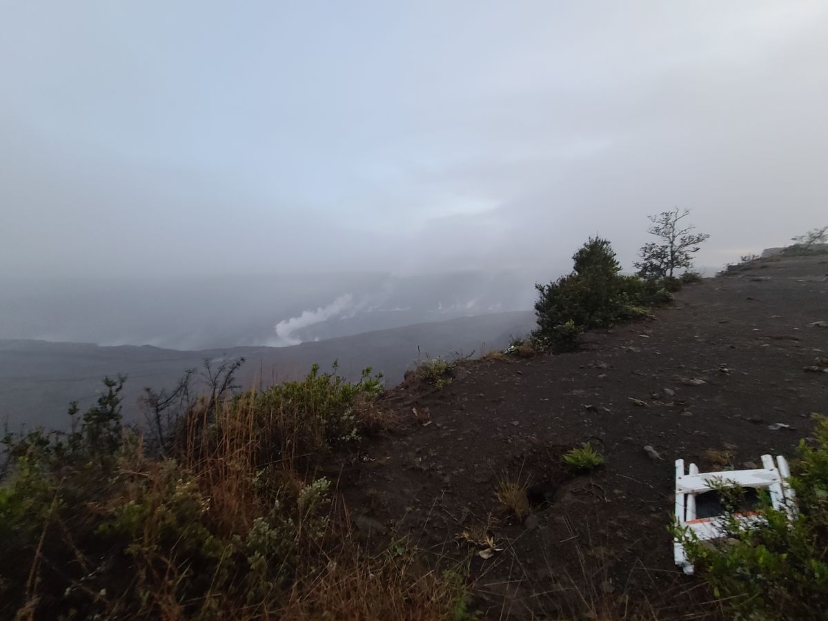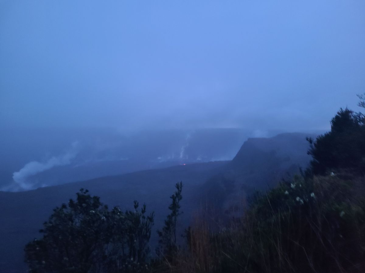 キラウエア火山ではツアー前日に活動沈静化したとのアナウンスが発表され、天気と相まって溶岩が見れないかも?と思っていましたが、夕暮れに火口に着いたときは雨とガスで火口も見えにくい状況でしたが、日没後雨もほぼ止み、チラリとだけでしたが火口の縁に赤く燃える溶岩を見ることが出来ました。