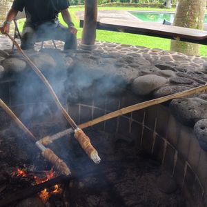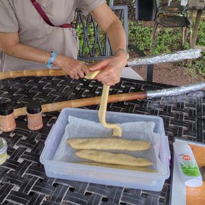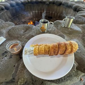 日本で育ったドイツ人オーナーさんが、いろいろあってハワイ島でバームクーヘンの生産をおこない、体験コースを提供してくれています。農園を案内してくれた後に、事前に準備してくれていた生地を竹の串に巻いて、焚き火を使って焼き上げ、出来上がりを熱々の状態で食することができます。ただ、この体験でできるものは、日本人が期待するバームクーヘンではなく、パンのようなものです。シナモンパウダーをふってあるナンのようなものと思って下さい。なぜハワイ島でこのような事業をしているのか、など、オーナーさんとの会話を楽しめる方には良いかと思いますが、本格的な日本風のバームクーヘンを期待していると違っているのでご注意下さい。オーナーさんは簡単な会話は日本語で対応してくれます。