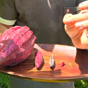 カカオの実を食べられたことが感動的な体験でした!カカオの実の香りは、日本のあけびのようでした。カカオの実はフレッシュで、ライチとあけびを足した様な味でした。