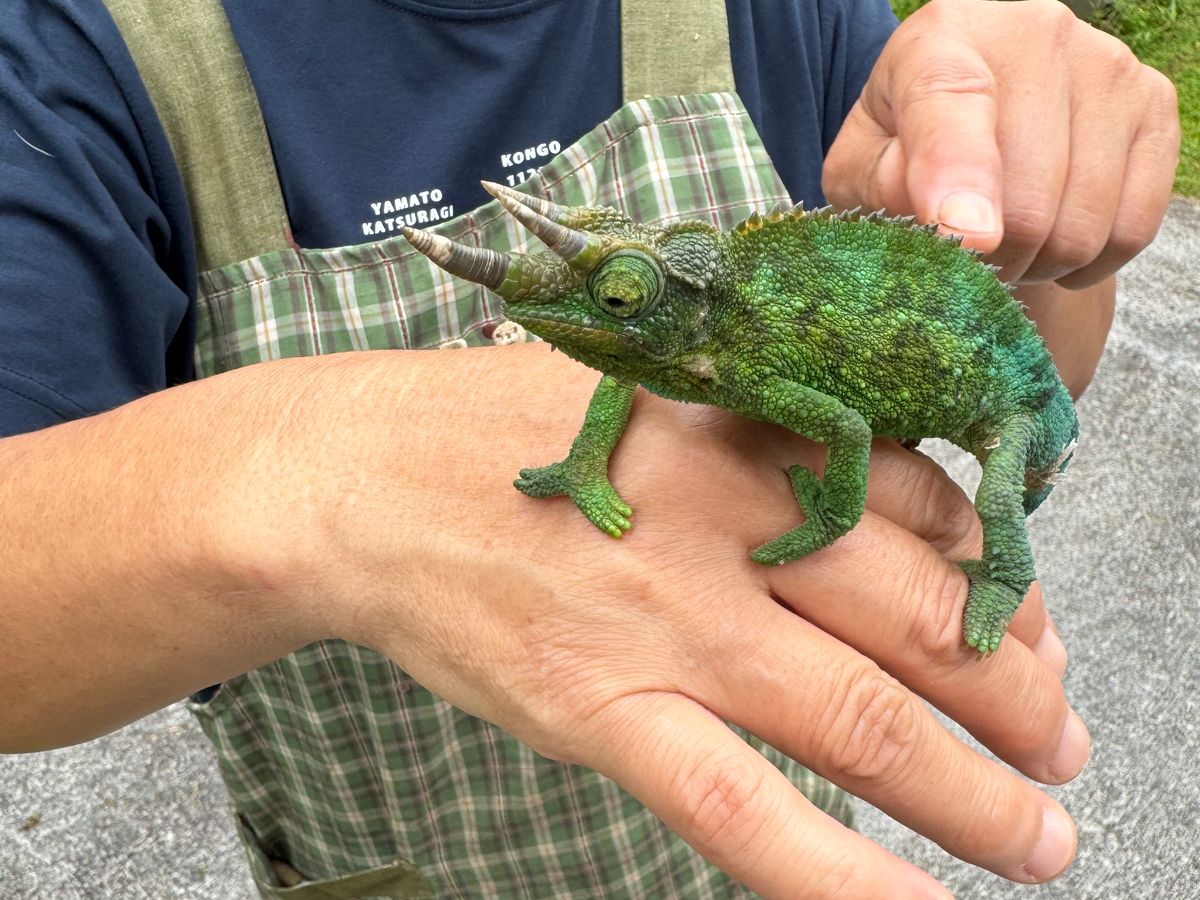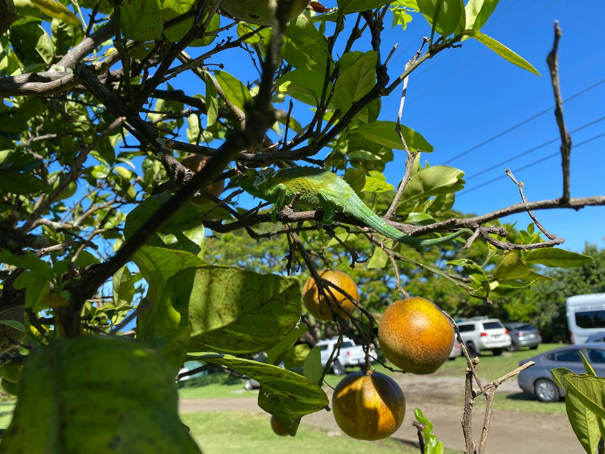 そこで思いもよらず野生のカメレオンがいると教えていただき、早速木の上にいるところを発見。