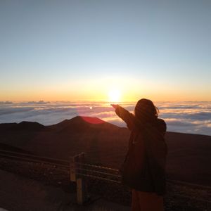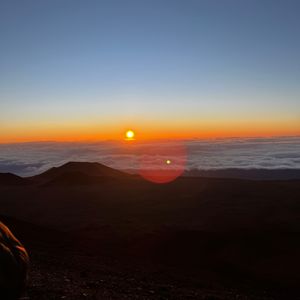 いよいよ山頂です。頂上まで舗装道路が続いているので、クルマから降りたら日の出前の雲海が青白く広がります。太陽が登るところから朝焼けがオレンジ色に雲海を照らし、その左手と反対側には望遠鏡が、右手にはマウナケアの聖なる山頂が見えます。気持ちがはやりますが、酸素濃度は麓の 80 %。高山病の症状であるふらつきや手足のしびれがあるはずなので、急に歩き回らず落ち着きましょう。気温はオニヅカ・センターより温かい 4 ℃と言えど寒いので、高山病の症状緩和と寒さ対策を兼ねながら歩き、自由に鑑賞と写真撮影をしましょう。ガイドさんも様々な写真を撮ってくれます。その間に太陽の頭が雲海から出はじめ、辺りをオレンジ色の朝日で眩しく照らします。太陽が少しずつ登る様子に見惚れていると、雲海から思ったより早く登り出てしまいます。しかしながらその動きは、星空鑑賞のときと同じく、大地と宇宙を感じられ、ハワイ島に来た甲斐があったなと感じられます。