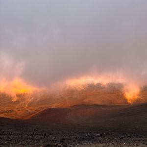 山頂に向かいます。道路に舗装はなく、ガイドさんが路面を選びながら走ってくれるのですが、激しく揺れます。しかしここでは耐えるだけの道中ではなく、空が明るくなり始めるので、白い雲海とあかね色の空、そしてマウナケアの真っ黒な山肌がグラデーションを作り、風景と時間変化を楽しめます。