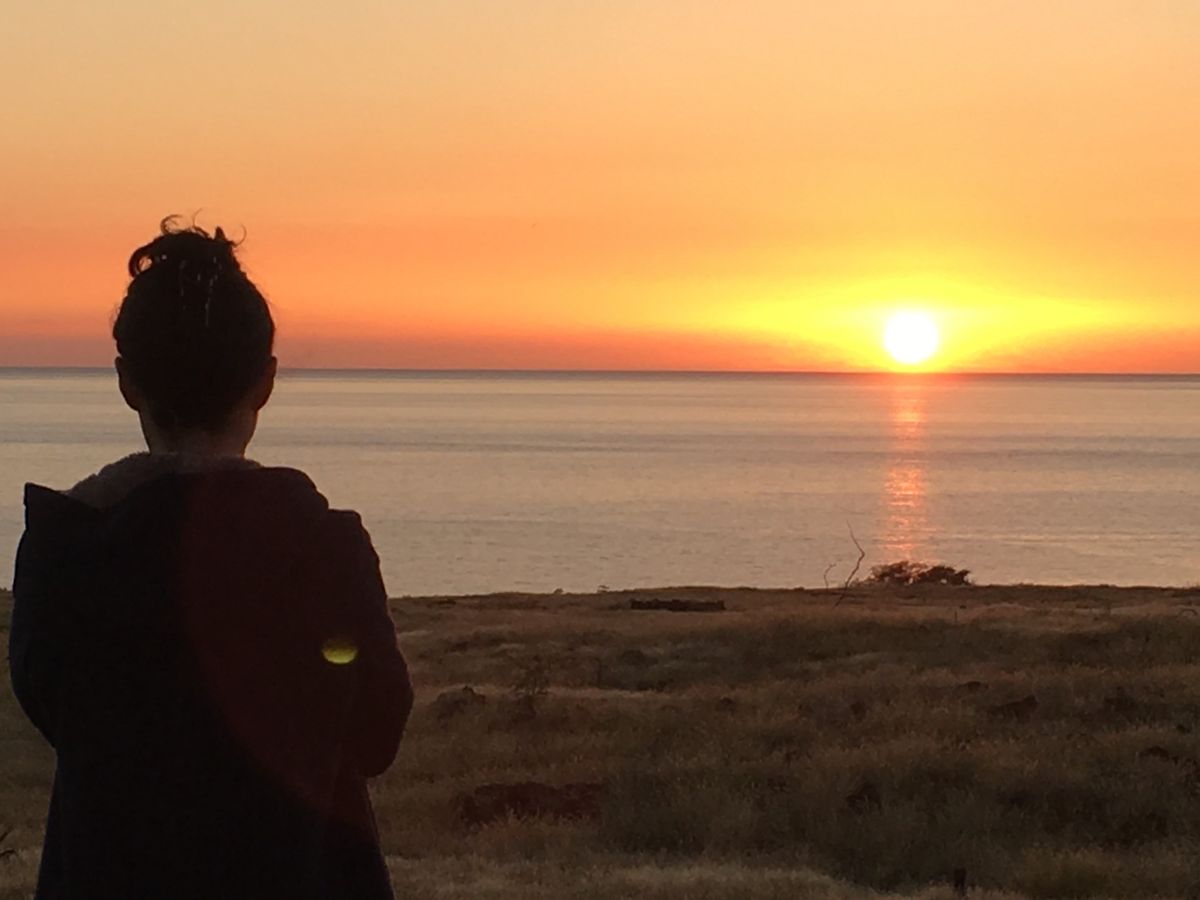 最初に夕日が綺麗に見えるスポットで、写真を見たり、クジラを探したり!