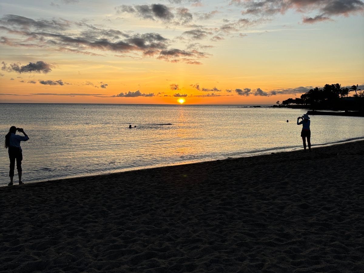 まず日没を考慮してカイルア・コナのマリオットホテルのプライベートビーチで夕日を鑑賞。正直なくても良いのですが、現地へ直行すると早すぎるのと、あとからなぜ時間調整したのかがわかりました(それはのちほど)