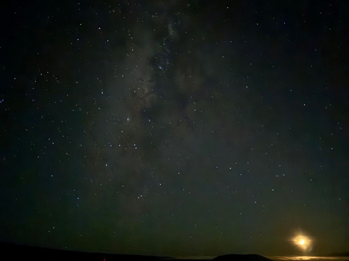 下は雲が出ていて、難しいのかな?と思っていたが、標高上がるにつれて、雲の上に。 星がくっきりと、そして月のクレーターが双眼鏡でも見れました!