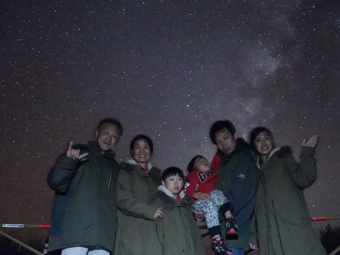 満天の星空は、言葉では形容できないほどの感動。さらにSDを持参すれば、ここは貸切ツアーの強み。ガイドのあゆみさんのカメラで何度でも家族写真を撮ってくれます。自分のカメラでは撮れませんでした。