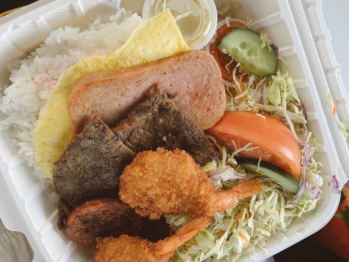 夕飯のお弁当を溶岩台地でいただくとの事だったのですが、とても風が強く、寒いので車中でいただきました。ハワイアン弁当、冷たくて不味いだろうと思って諦めていましたが、ほんのり温かく味は日本人好みの味付けだと思います。