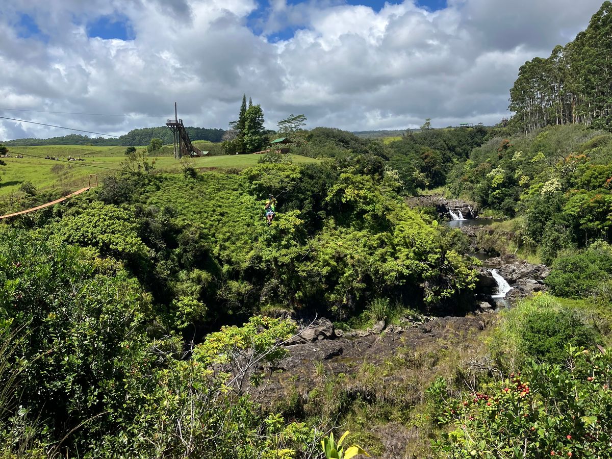 初めてのジップライン体験!10人くらいの参加者で、最初はインストラクターに手伝ってもらいながらハーネス?やヘルメットなどの必要な装備を装着。そこからワゴン車に乗って丘の上の方にある出発点に連れられて行かれます。到着したらジップライン滑空時の注意事項などの説明を受け1本目の草地の上のジップラインを下り基本動作を確認。その先は三連滝のある渓谷の上や川の上を結構なスピードで続けて下って行きます。途中で水分補給やフルーツをいただいて休憩も取りつつ最も長いので600mを超える長さのものを含む8本のジップラインを爽快感を味わいながら下りました。(本来9本ながら8番目のジップラインがメンテナンス作業中だったため計8本に)スピード感、高さとも最初はちょっと怖いくらいでしたが、最後の方では景色を楽しむ余裕が出て来ました。慣れている大人や子どもの中には逆さまになって下る人たちもいて楽しんでいました。