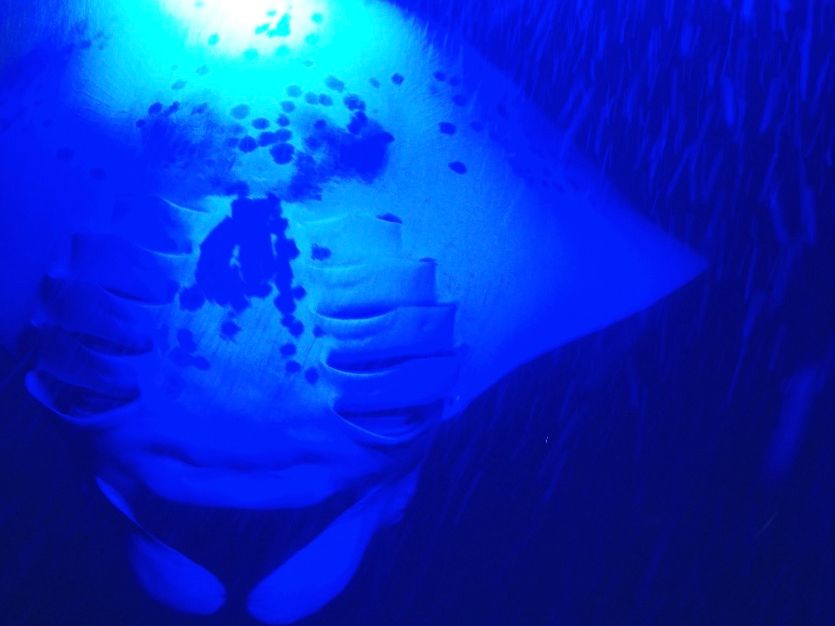 夜の海はとても神秘的です。浮き具につかまり下を覗くと、すぐにマンタがやってきてくれました。50分程の間に5〜6頭やってきては、華麗な舞を披露してくれました。可愛くて、時間の経つのも忘れ、みんな大興奮‼︎ 主人はそろそろ上がりたかったみたいですが、私はいつまでもいつまでも見ていたかったです。帰りも5分程で船着場に到着。心配していた寒さも感じず、大満足の夜でした。