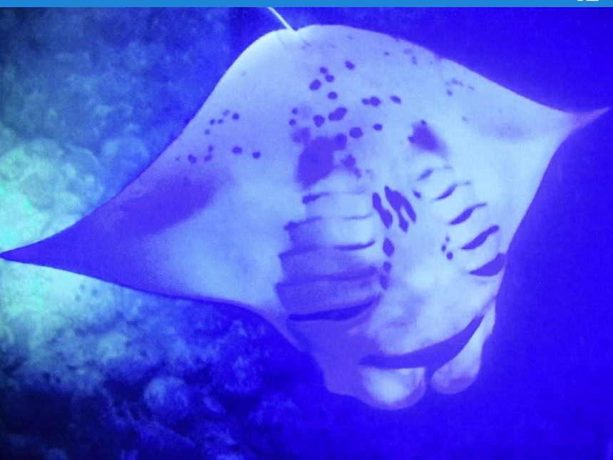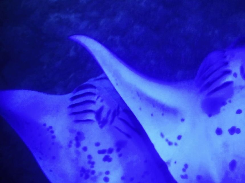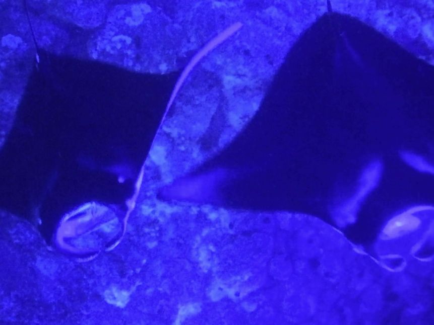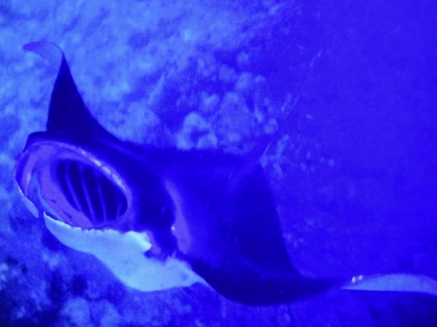 幻想的な光の中を3枚のマンタが海底から優雅に上がってきて、グルグルと大きく踊るように回る様子は本当に美しく、感動的な光景でした。