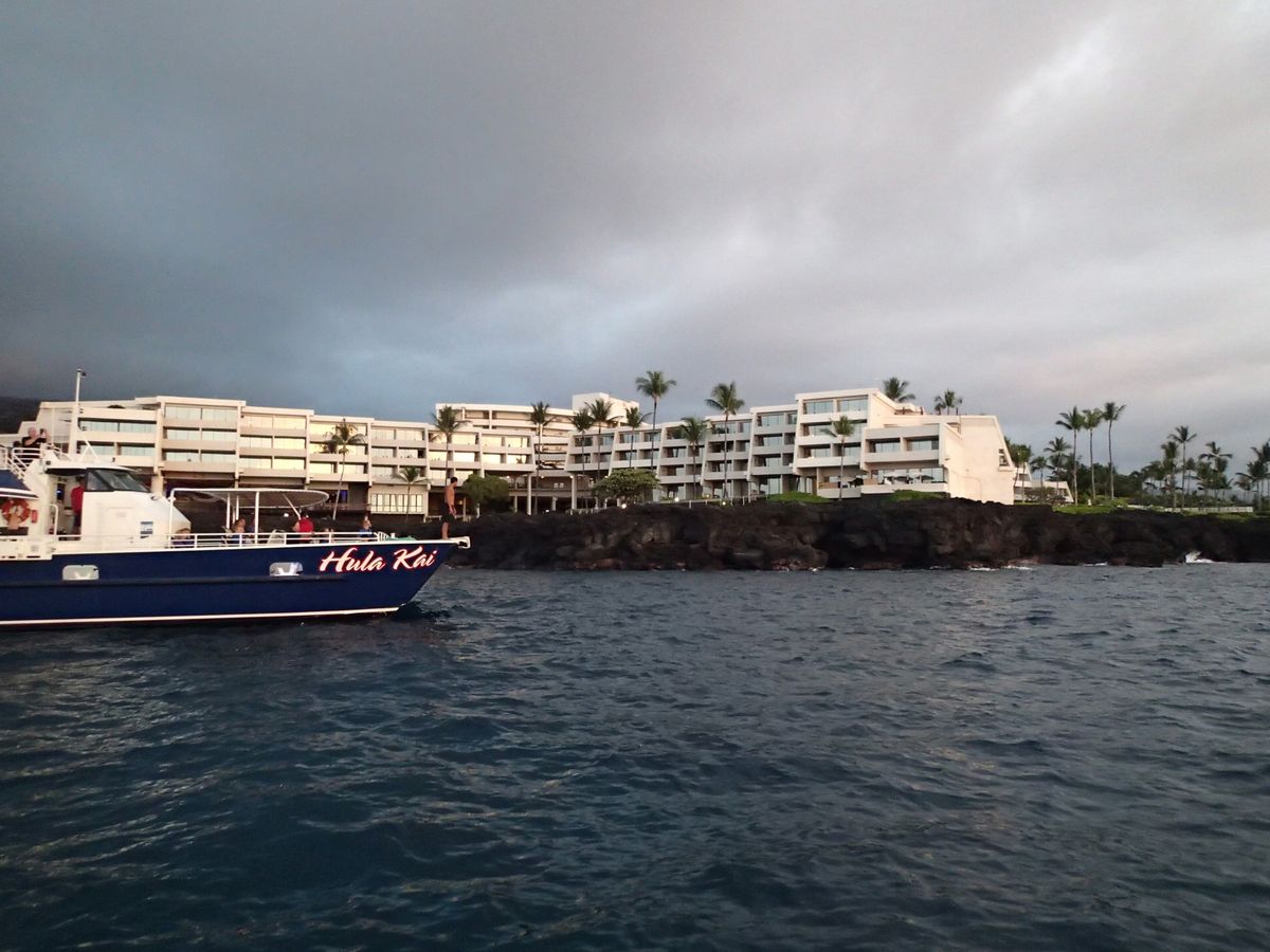海と動物が好きな夫が切望していたツアーでした。暗くなる直前に乗り込んだ大型ゴムボートはスピードと波で振り落とされそうなほどスリリングでしたが、乗客皆でキャーキャー言いながら目的の場所に着きました。すぐに長い浮きに捕まってのマンタ見学となり、じっと浮いているとマンタが次から次へとやってきて、信じられないほど近くで大きな口を開けながらクルクルと回転しはじめました。こんな光景は見たことない!感激でした。ジッとマンタを待っているときはちょっと寒さが沁みてきますが、マンタが近くに来てくれたら寒さも忘れて見入ってしまいました。ハワイ島に行ったら是非体験するべきオプションかと思います。