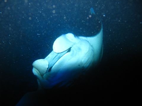 マンタを見るうえでの注意として「さわってはいけない」というものがあり、ガイドさんからも「数インチの所まで寄ってくることがありますよ」と言われ、半信半疑で海に入ってマンタを待つ。マンタが餌とするプランクトンを光で集め、そこにマンタが食事にくるという仕掛け。多くのシュノーケラーとダイバーが見にきているので、マンタの動きを邪魔しないようシュノーケル組は浮きにつかまって海面から見る。もぐったりしてはいけないと言われ、少々残念に思っていたがとんでもない。マンタが大きな口をあけて目の前までせまってくる。そしてクルリと宙返り? 口の中、お腹の模様、はっきり見える!