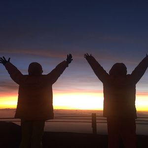 今回、ハネムーンで念願叶って初めてのハワイ島へ行けることになり、色々と調べていたところ、こちらのツアーが目にとまりお世話になりました。ホテルまで迎えに来て頂き、途中ワイコロア周辺でトイレ休憩も有り(スーパーもあったのでお土産等も短時間で沢山買ってしまいました。笑)時間が少しあると言うことで海へも連れてって頂きました。この後、他のホテルの方も順々にピックアップし、マウナケアへ向けて全員で出発です!まずは途中のオニヅカビジターセンターで夕食タイム♪夕食は幕の内弁当とお味噌汁でした。雲ひとつない快晴で青空の下でのお弁当は最高です!夕食後は防寒具をお借りして、いよいよ頂上へ向けて出発!私は酔いやすいタイプなので、酔い止めを飲みました。(結果、飲んでおいて良かったです。砂利道を上がっていくので揺れが凄いかった)車中から雲海も綺麗に見れて既に結構感動物です。頂上付近につくと酸素が地上より薄いので、車から降りると体がフワフワしてましたが徐々にそれも慣れてきます。そんなことよりサンセントが素晴らしすぎてそんなことも忘れてしまいます。初めてあんなに感動するサンセットを見れました。ここぞとばかりに写真も撮り、ツアーの方にも沢山写真を撮って頂きました。サンセット後は頂上より少し下ったところの路肩にて星空観測です♪もう悲鳴ものでした!日本でこんなに沢山の星を見たことが無い!!ガイドさんがレーザー棒で星の説明を沢山してくれたので、時間が経つのも早くとても楽しく星空を鑑賞できました。私のカメラでは星なんて全く映らなかったのですが、ガイドさんの高性能カメラで星空と遠くに赤く映るキラウエアの火口をバックに写真撮影もして頂き、形にも残る星空観測ができて大満足でした。帰りもホテルまで送って頂き、ホテルに着いたのは24時近くだったと思います。帰りの車では爆睡でした。笑 道中、ガイドさんも色々とお話してくださり退屈しない移動でしたし、記念に残る写真も撮って頂けたので、結果こちらのツアーでお世話になり本当に良かったと思います!またハワイ島に行ける機会が出来たときには、ぜひまたお世話になりたいと思えたツアーです♪