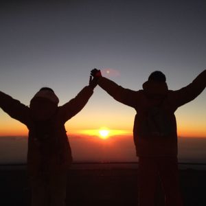 ハワイ島到着の翌日のツアー予約でしたがマサシネイチャースクールから連絡を頂き当日は山頂の風が強そうなので1日延期した方が良いと言われ翌日に変更してもらいました。幸運にも翌日は風も無くおだやかで絶好のツアー日和になり降るような星空とガイドの専門的な解説で大満足。カメラを持っていなくてもガイドさんのプロ的テクニックで星空バックに記念写真を撮ってくれます。何処かの観光地のように1枚いくらなんてケチなことは言いません。無料でリクエストにも気軽に応じてくれます。星空バックに記念写真なんて素人では取れませんからね?これだけでも充分満足ですが肉眼で木星と土星を見せてくれました。さらに30年に1度、しかもこの時だけしか見れない5つの惑星が一直線に見える時期と合わさりラッキーでした。オニヅカセンターで飲ませてもらったあったか~いココアが美味かった。ここから山頂までは未舗装道路を4駆で一気に駆け上がり空が明るくなり始めたころ到着です。そして日の出です。ここでも思い思いのポーズで記念写真を撮ってくれます。ここでしか見られない朝日による山の影や日の出直前のアルペングローなど感動の時間がアッという間に流れた一晩でした。このアクティビティーは間違いなしで100%満足します。