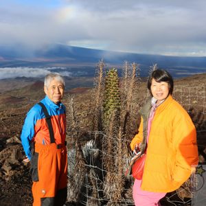 ”満天の星空を見たい!”との息子の一声で実現したツアー参加でした。 前日は火山見学に一日を過し、寝る間も無く真夜中の出発と、77歳の老体にはかなりきついスケデユールになりましたが、どうにか無事にこなすことが出来ました。 肝心の星空は、折から中天にかかる半月の光で、もうひとつという感じでしたが、博識のなガイドさんの説明を聞きながら、若い頃に読んだ星とその伝説を思い出して、心から楽しむことが出来ました。 マウナケア山頂での日の出は、正に壮観でした。 山頂の寒さ感と空気の希薄感は予想以上でした。 真の山頂までは後僅かのようでしたが、これを歩いて登るのは大変かもしれません・・ 次に機会があれば、夕日と星空観測ツアーに挑戦してみたいと思います。